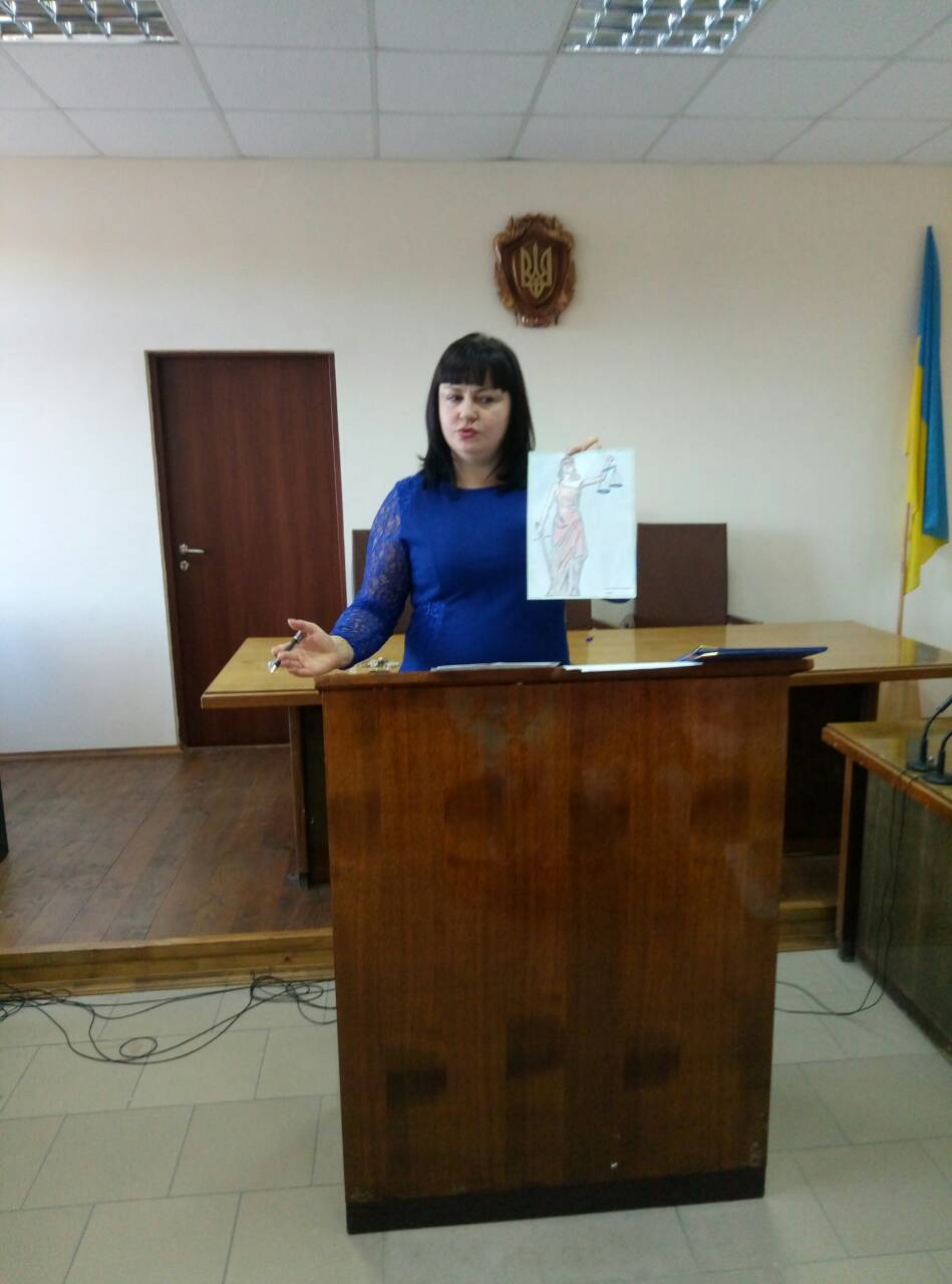 Відкрила захід суддя-спікер Тетяна Василюк, яка розповіла відвідувачам історію створення суду, його діяльність, основні принципи судочинства, а також про притаманні судовій системі атрибути - символи судової влади, порядок ухвалення судових рішень.